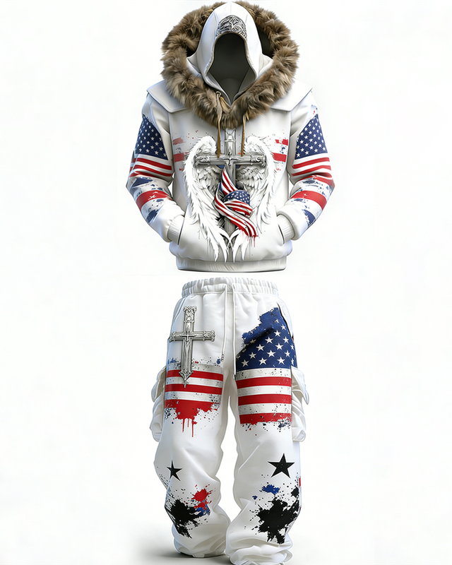 Men's Spring Fashion Color-Block Embroidered Faux Fur Collar Hoodie and Pants Two-Piece Set 4659