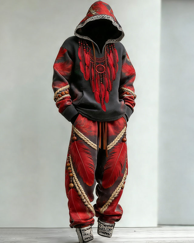 Men's Fashion Gradient Feather Hoodie and Pants Two-Piece Set 7423