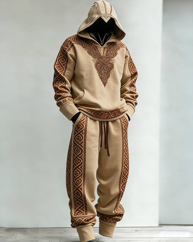 Men's Fashion Viking Linen Hooded Sweatshirt and Pants Two-Piece Set 8828