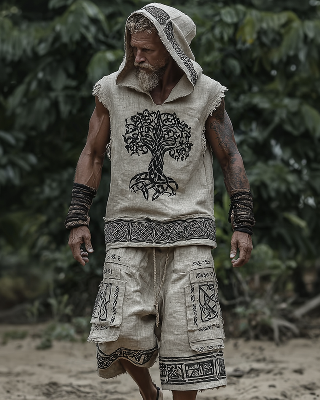Men's Viking-Style Fashion Contrast-Color Embroidered Hooded Sleeveless Top & Shorts Two-Piece Set 1230