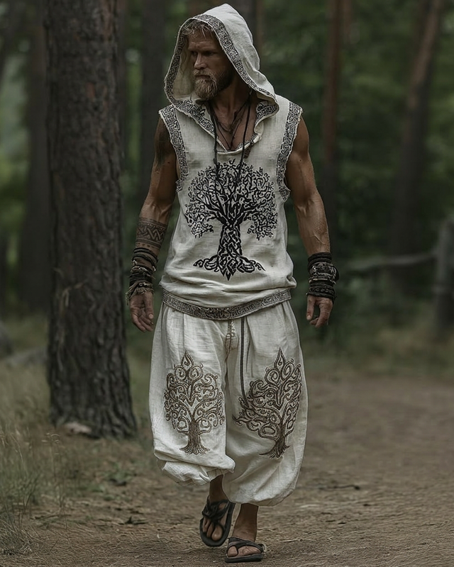 Men's Viking-inspired color-blocked embroidered hooded sleeveless top and pants two-piece set 9301