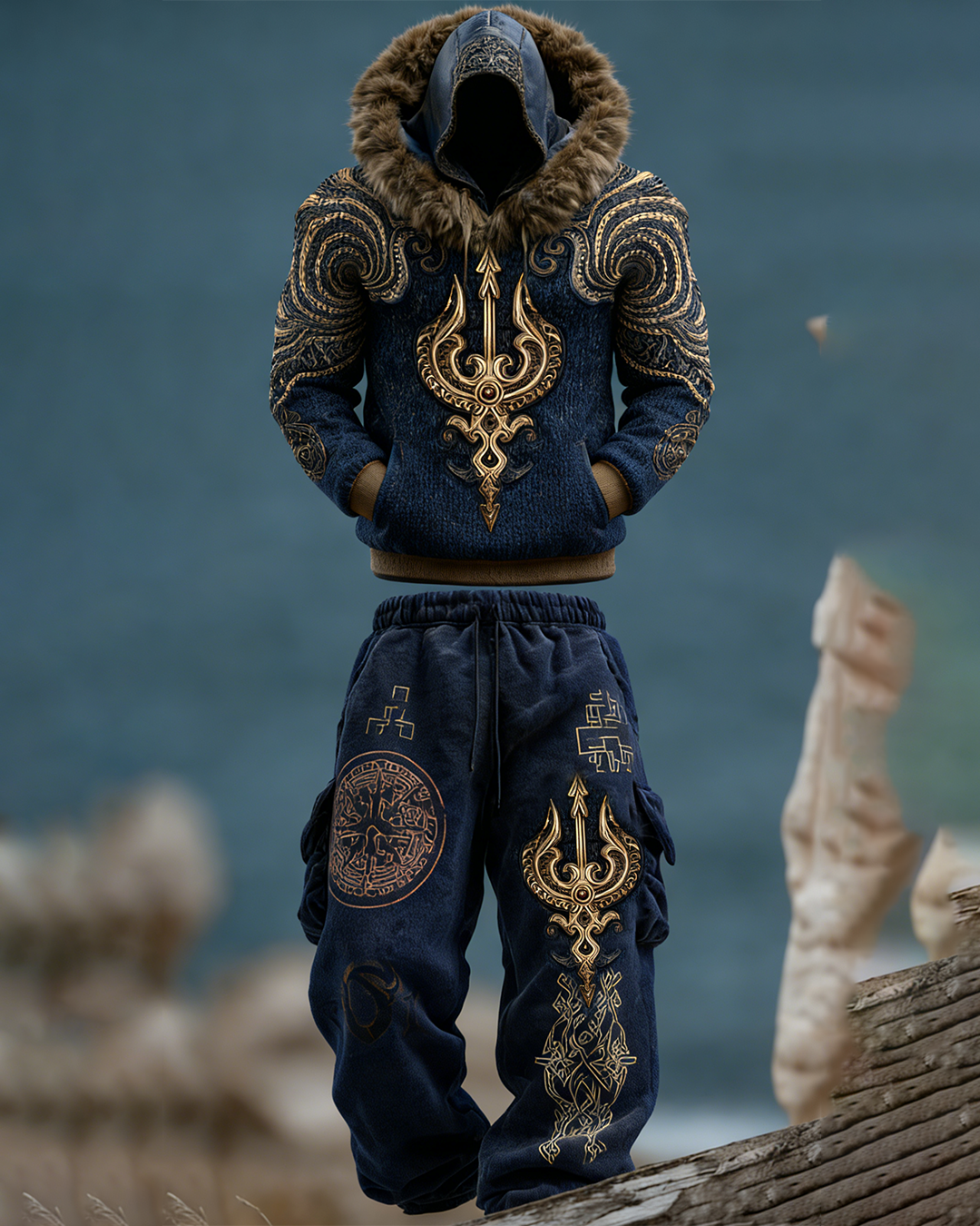 Men's Viking-Style Faux Fur Collar Embroidered Hoodie and Pants Two-Piece Set 9774
